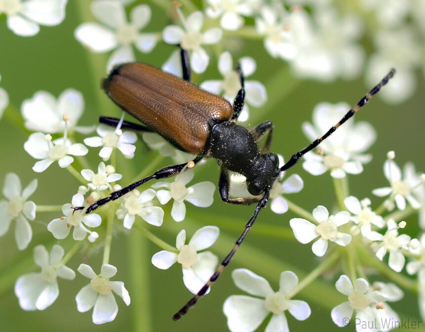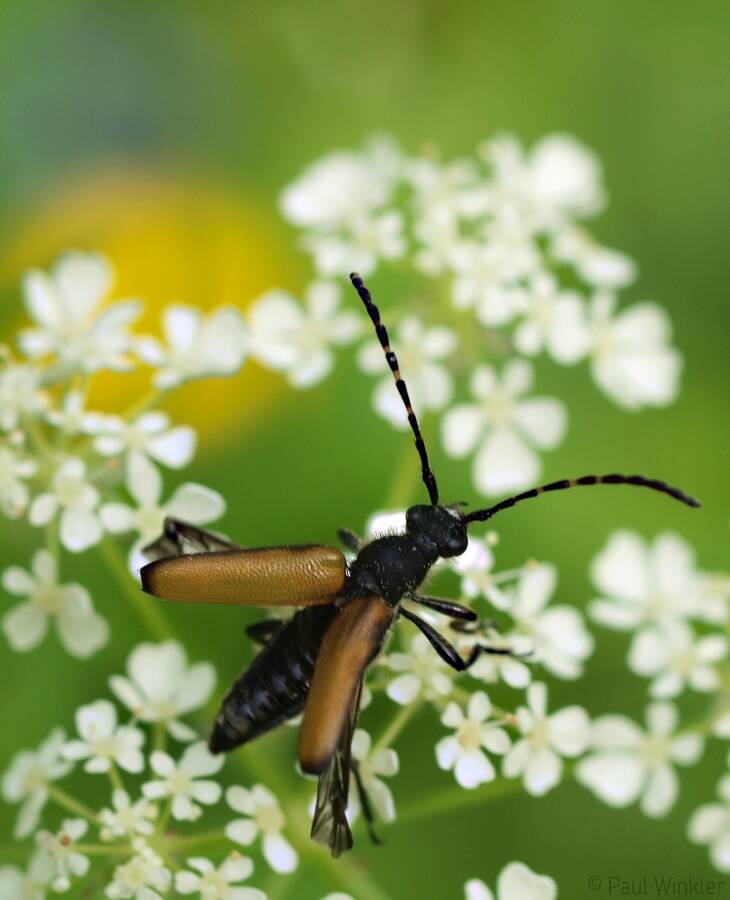 Stictoleptura fulva (Schwarzspitziger Halsbock)Dinoptera collaris (Blauschwarzer Kugelhalsbock)