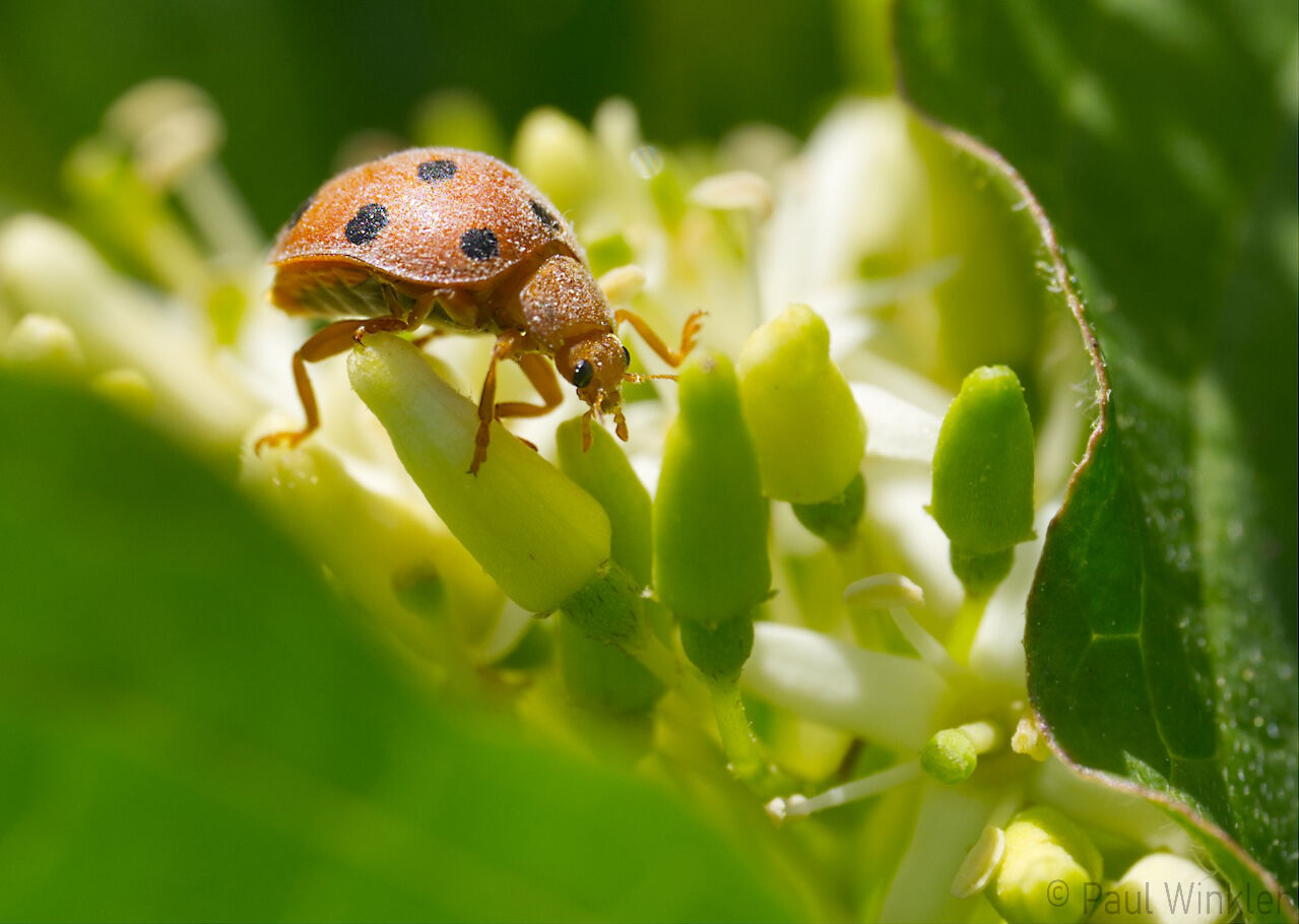 Tytthaspis sedecimpunctata (Sechzehnpunkt-Marienkäfer)Scymnus femoralis (Dunkelschenkliger Zwerg-Marienkäfer)