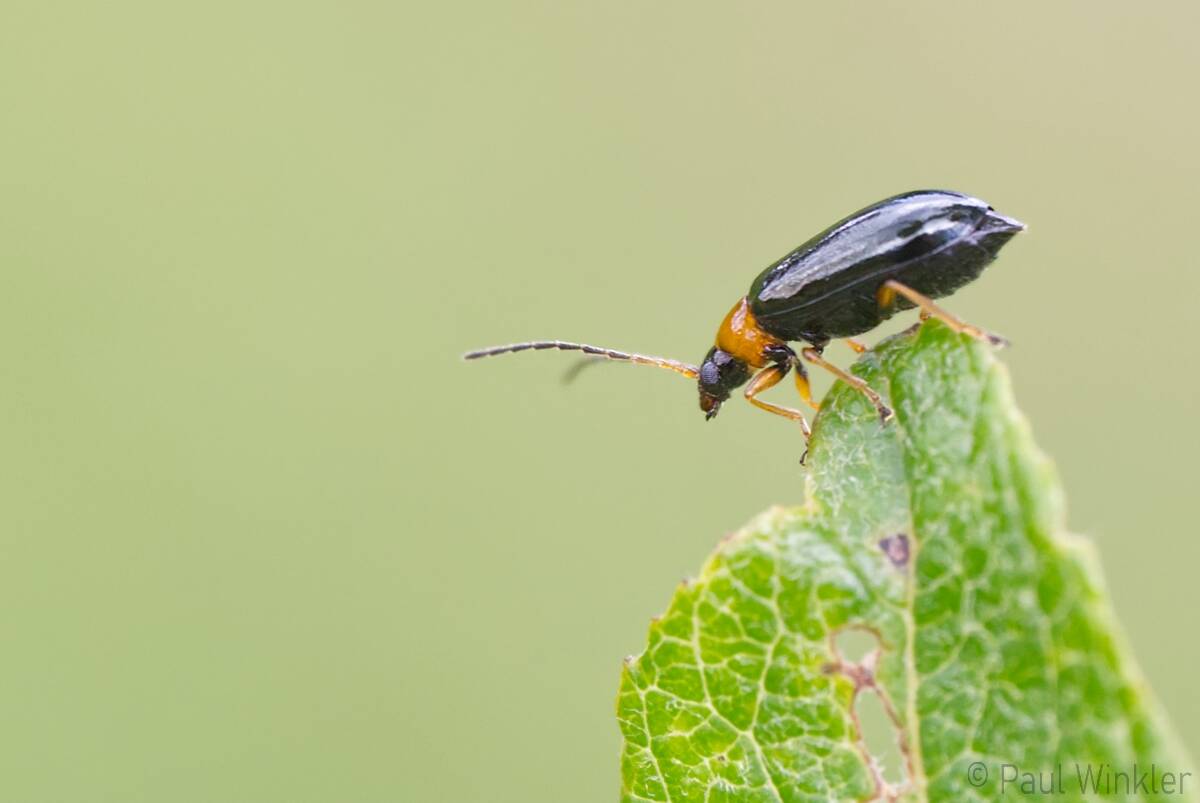 Lochmaea capraea (Braungelber Weidenblattkäfer)Luperus longicornis (Schwarzer Weidenblattkäfer)